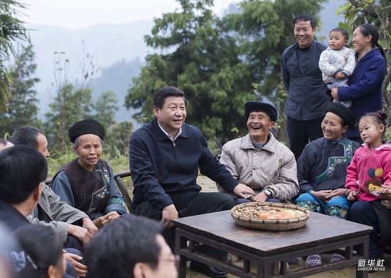 ↑2013年11月3日,習(xí)近平在湖南湘西土家族苗族自治州花垣縣排碧鄉(xiāng)十八洞村同村干部和村民座談。