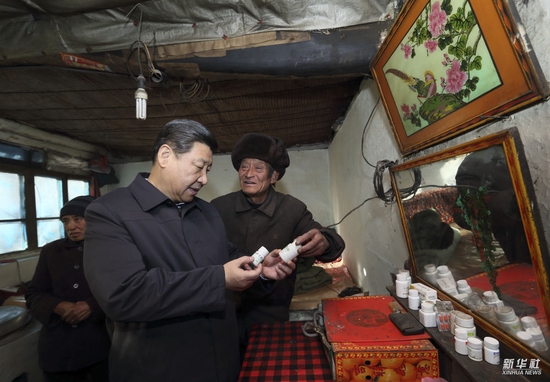 ↑2012年12月30日,習(xí)近平在河北阜平縣龍泉關(guān)鎮(zhèn)駱駝灣村困難群眾唐榮斌家,詳細(xì)詢問身體有病的唐榮斌日常服藥情況。