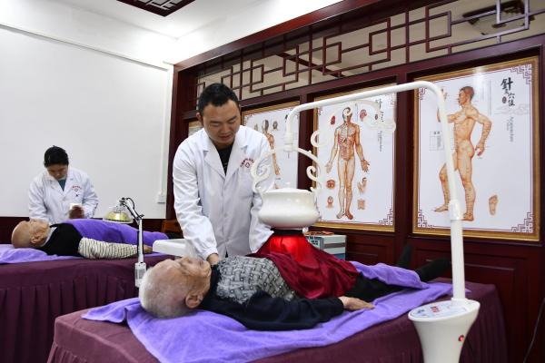 △江西省興國(guó)縣田莊上養(yǎng)老中心的醫(yī)護(hù)人員為老人進(jìn)行中醫(yī)理療。
