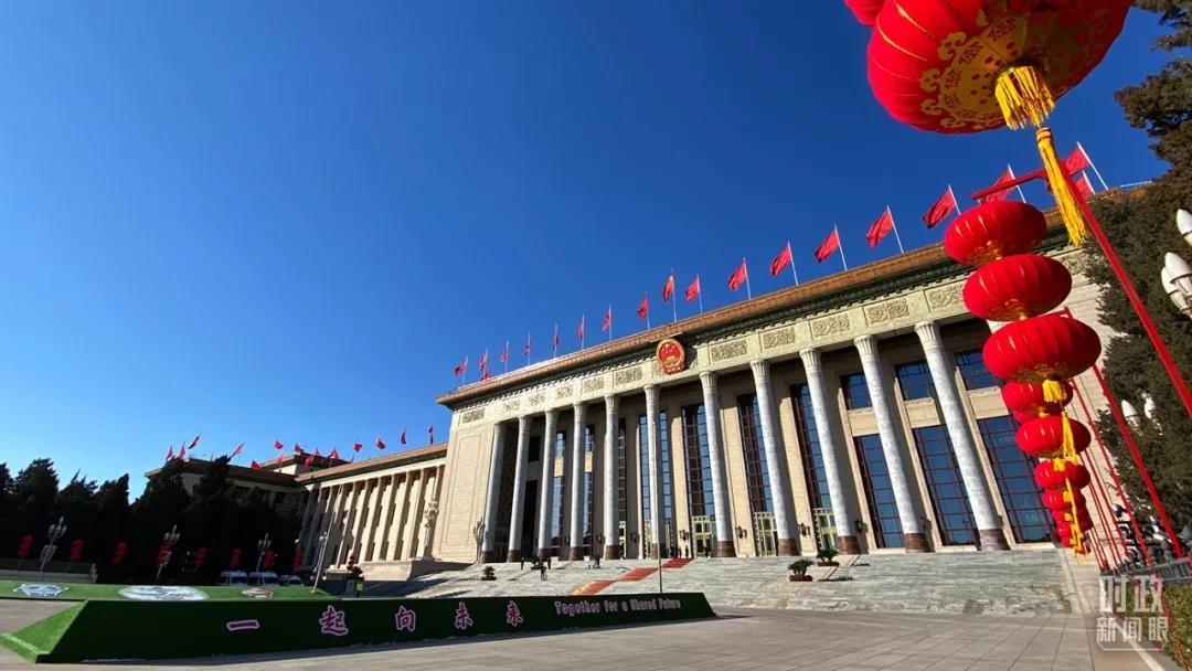 △人民大會(huì)堂外,為迎接冬奧新設(shè)計(jì)的“一起向未來”字樣格外醒目。(總臺央視記者石奇用拍攝)