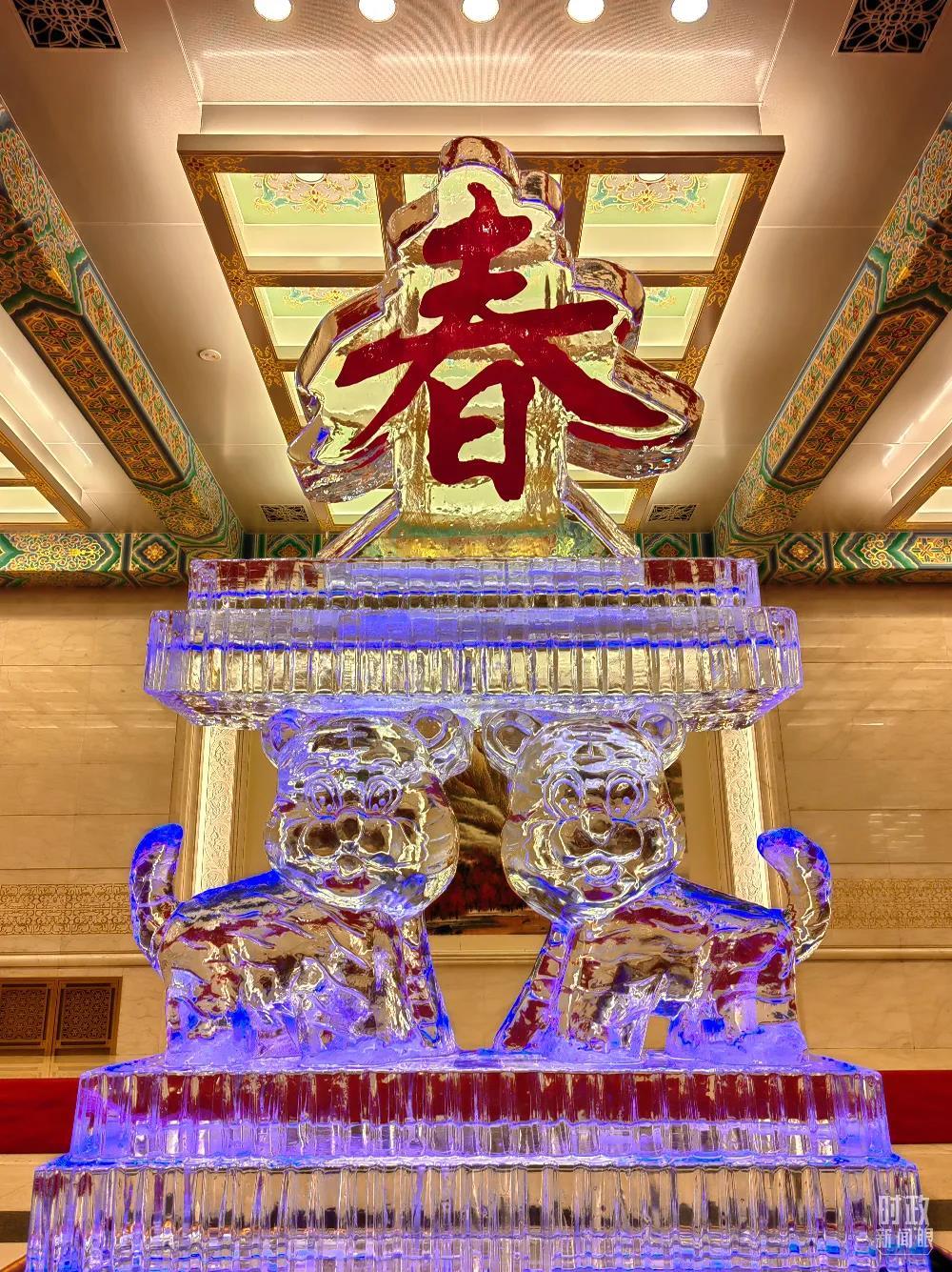 △宴會(huì)廳擺放的“春”主題冰雕。(總臺央視記者鐘鋒拍攝)