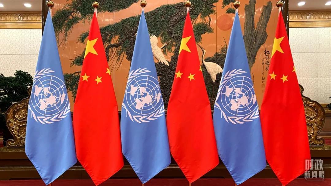 △會(huì)談現(xiàn)場的聯(lián)合國旗幟與五星紅旗。(總臺央視記者段德文拍攝)