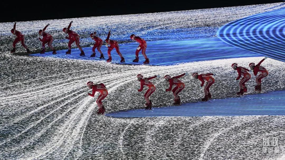 △開幕式上,滑冰運(yùn)動(dòng)員滑過冰面后,留下長長的軌跡。(總臺國廣記者李晉拍攝)