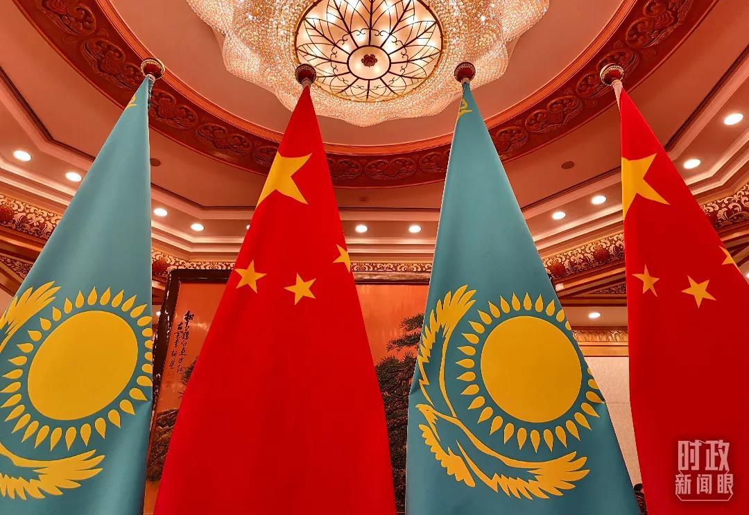 △2月5日上午,會(huì)談現(xiàn)場擺放的中哈兩國國旗。(總臺央視記者楊立峰拍攝)