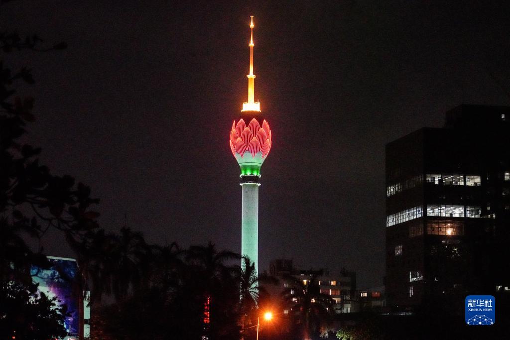 這是1月31日在斯里蘭卡科倫坡拍攝的點亮“中國紅”的蓮花電視塔。新華社記者 唐璐 攝