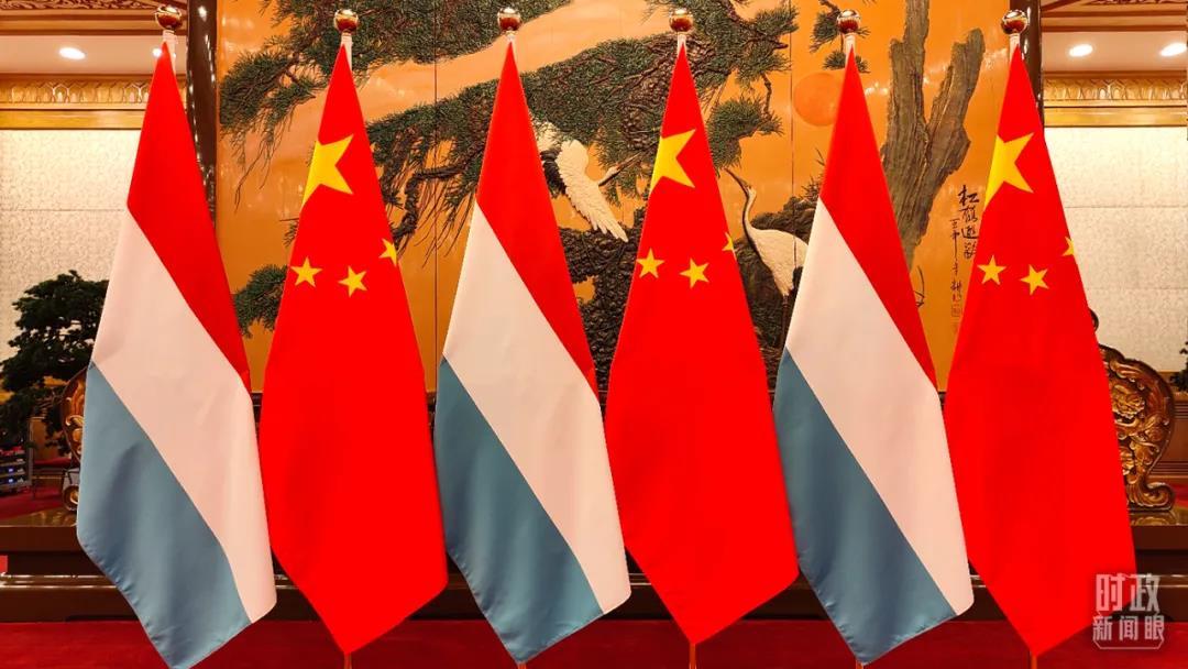 △會(huì)談現(xiàn)場(chǎng)擺放的盧森堡國(guó)旗和五星紅旗。(總臺(tái)央視記者楊立峰拍攝)