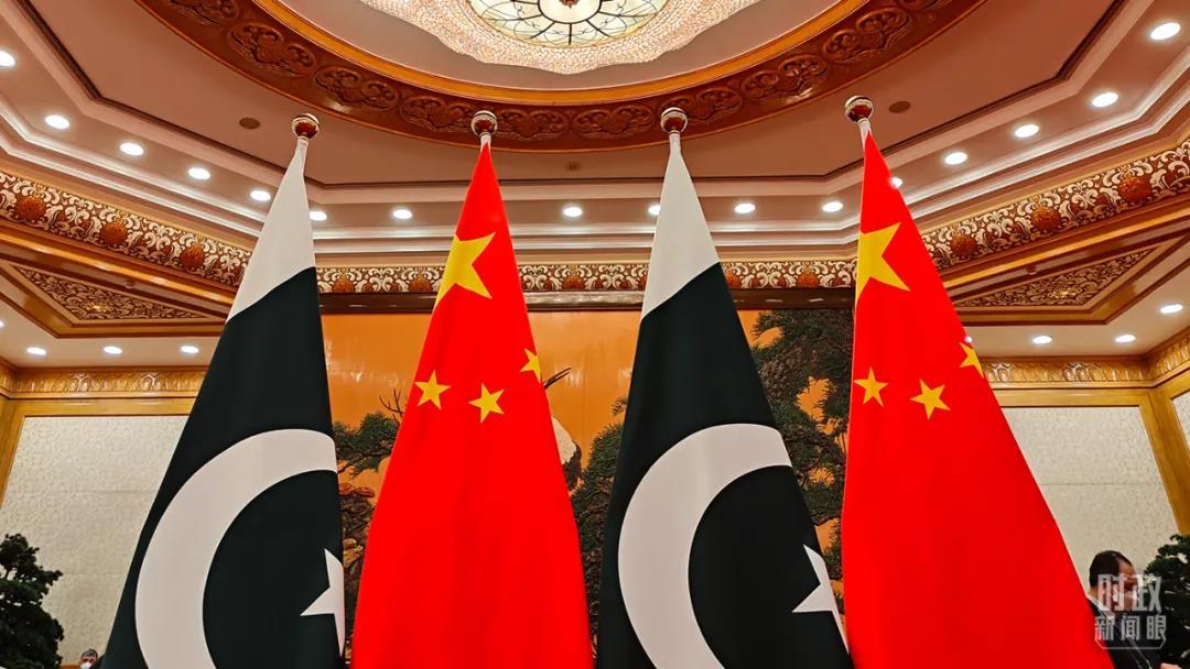 △會(huì)談現(xiàn)場(chǎng)擺放的巴基斯坦國(guó)旗和五星紅旗。(總臺(tái)央視記者楊立峰拍攝)