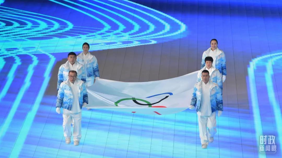 △北京冬奧會(huì)開(kāi)幕式上,6名旗手手執(zhí)奧林匹克會(huì)旗入場(chǎng)。(總臺(tái)記者廖江衡拍攝)