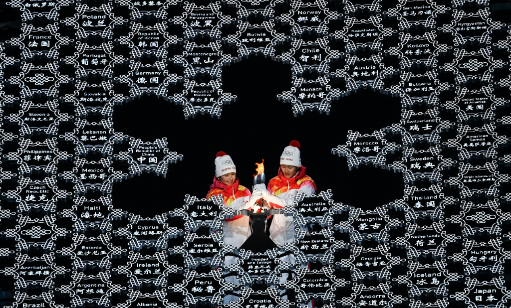 ↑這是最后一棒火炬手迪妮格爾·衣拉木江(左)和趙嘉文將火炬嵌入“大雪花”中央。新華社記者李尕?cái)z