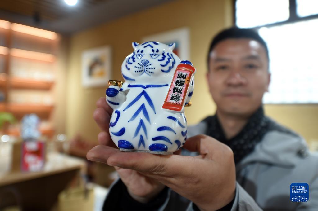 1月28日,在河北省平山縣西柏坡鎮(zhèn)北莊村西柏坡文創(chuàng)館,工作人員展示特色文創(chuàng)產(chǎn)品。新華社記者 駱學(xué)峰 攝