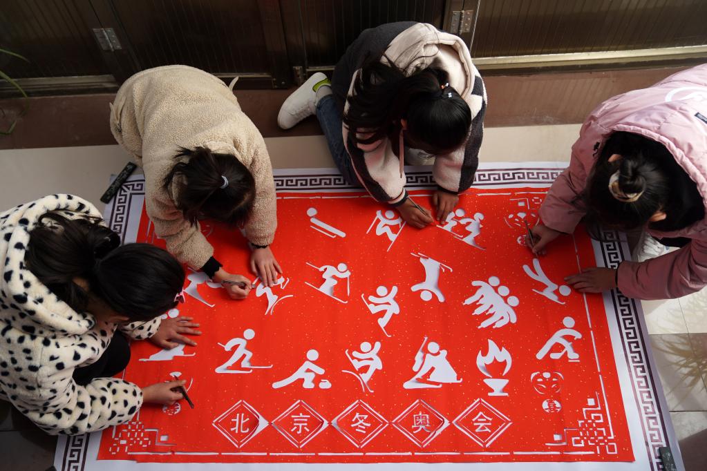 農(nóng)歷壬寅年到來(lái)之際,在河北省臨城縣東鎮(zhèn)鎮(zhèn)南孟村,村民圍繞“迎冬奧”主題剪紙。新華社發(fā)(陳雷攝)