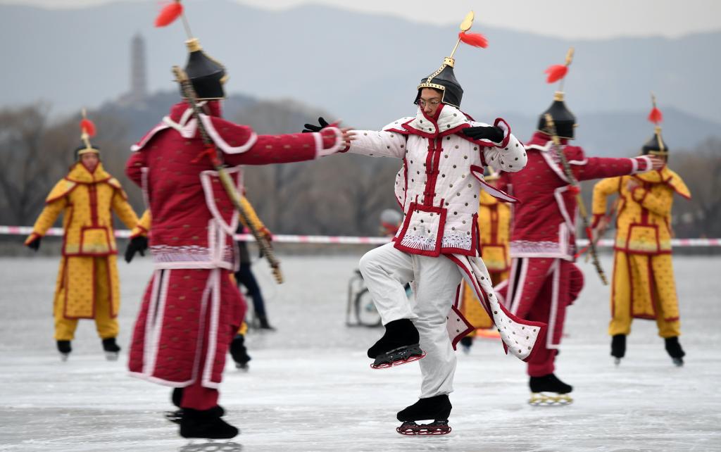在北京頤和園冰場(chǎng)舉辦的還原清朝八旗官兵冰嬉活動(dòng)的表演(2018年1月21日攝)。新華社記者 李俊東 攝