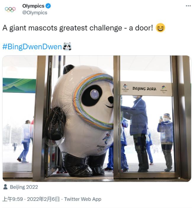 奧運會官方英文推特賬號2月6日發(fā)布了一張冰墩墩卡在門里的照片,配文寫道“一個巨大的吉祥物最大的挑戰(zhàn)——一扇門”,獲得了1000多次轉(zhuǎn)發(fā)和5000多個贊。