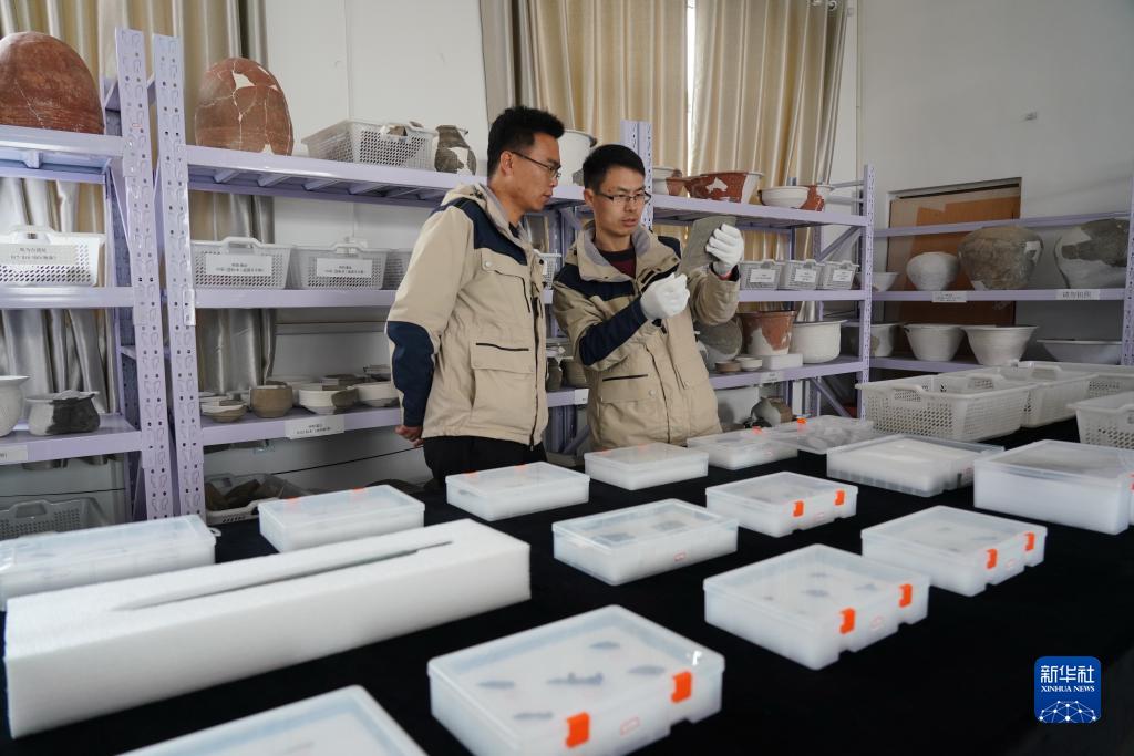 考古隊(duì)員在研究河北雄安新區(qū)南陽遺址的出土器物(2021年3月19日攝)。新華社記者 牟宇 攝