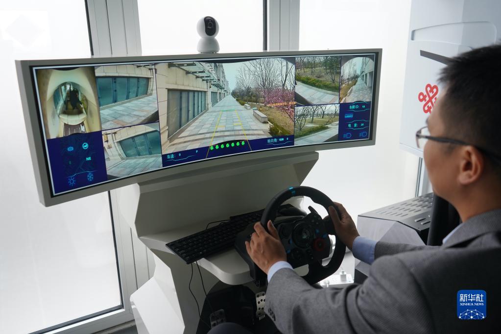 在雄安數(shù)字交通實(shí)驗(yàn)室,負(fù)責(zé)人任大凱對無人駕駛汽車進(jìn)行遠(yuǎn)程操控(2021年3月26日攝)。新華社記者 金皓原 攝