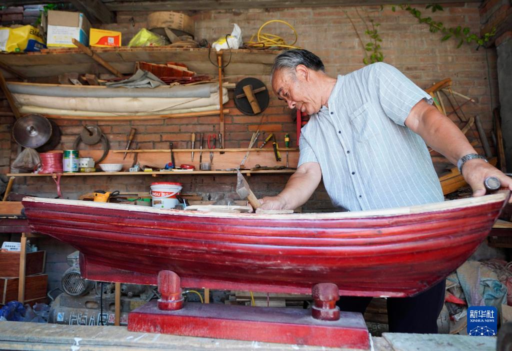 河北雄安新區(qū)安新縣馬家寨村人劉廣玉在制作木船模型(2019年7月25日攝)。新華社記者 邢廣利 攝