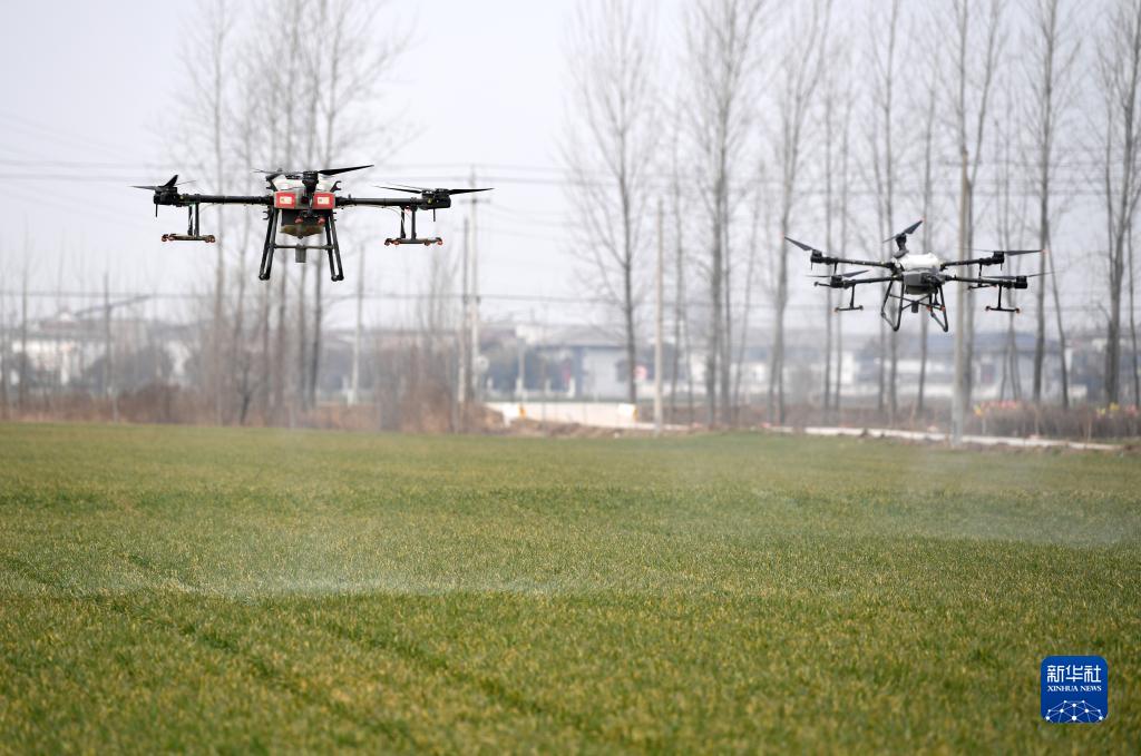 2月11日,無(wú)人機(jī)在安徽省亳州市趙橋鄉(xiāng)“無(wú)人農(nóng)場(chǎng)”噴灑除草劑。