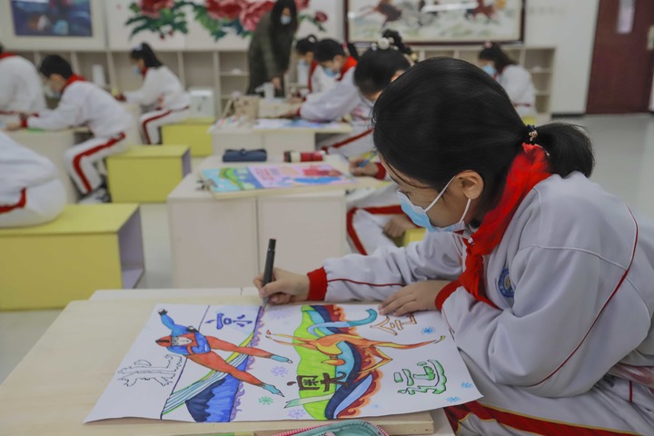 2021年11月17日,河北省唐山市路北區(qū)世嘉實(shí)驗(yàn)小學(xué)的學(xué)生在進(jìn)行迎冬奧主題繪畫作品創(chuàng)作。新華社記者劉滿倉攝