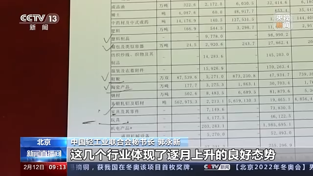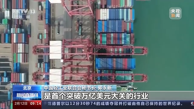 中國輕工聯(lián)合會秘書長 郭永新:這是12月份的全國出口重點(diǎn)商品,這是11月份的,體現(xiàn)了一個逐月上升的良好態(tài)勢。我們判斷今年輕工業(yè)的出口將突破10000億美元的大關(guān),是首個突破萬億美元大關(guān)的一個行業(yè)。