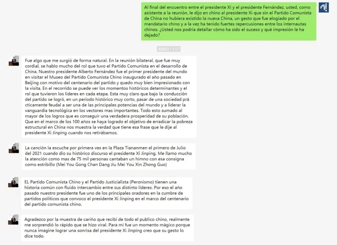 在與習(xí)近平主席的會晤中,他們討論了阿根廷的庇隆主義與中國共產(chǎn)黨的共性:堅持以人民為中心的發(fā)展思想;同時也強調(diào)了在中阿建交五十周年之際進一步加強雙邊關(guān)系。我們(正義)黨在對華關(guān)系問題上具有戰(zhàn)略眼光,并仍在逐步深入。