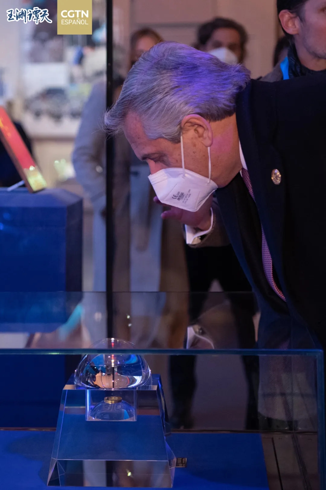 ▲阿根廷總統(tǒng)費爾南德斯參觀中國共產(chǎn)黨歷史展覽館月壤樣品