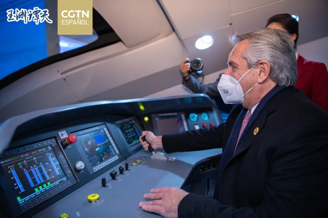 ▲阿根廷總統(tǒng)費爾南德斯在中國共產(chǎn)黨歷史展覽館體驗中國高鐵駕駛模型
