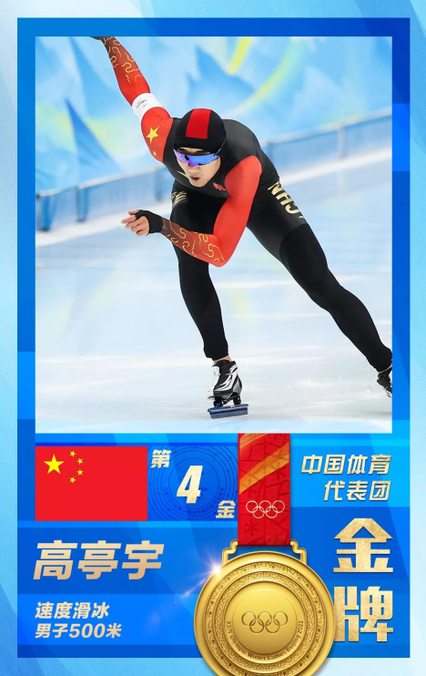 12日下午的“冰絲帶”再度見證了歷史!中國代表團(tuán)開幕式旗手高亭宇亮相速度滑冰男子500米賽場,以34秒32的驕人成績,打破了由挪威選手在2018年平昌冬奧會上創(chuàng)造的34秒41的奧運(yùn)會紀(jì)錄,為中國代表團(tuán)拿下第四金。