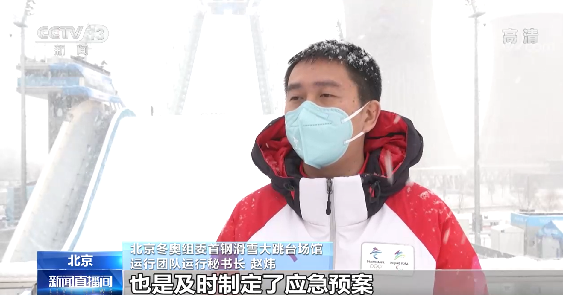 北京冬奧組委首鋼滑雪大跳臺場館運行團隊運行秘書長 趙煒:我們在5天以前就根據天氣預報,包括我們自己氣象團隊分析的情況,也是及時制定了應急預案。您可以看到身后的賽道,我們二次(賽道)塑形團隊從昨天(2月12日)晚上就已經24小時待命了。他們也會根據降雪的情況及時清理賽道表面的浮雪,以保障我們的訓練還有后兩天的比賽。