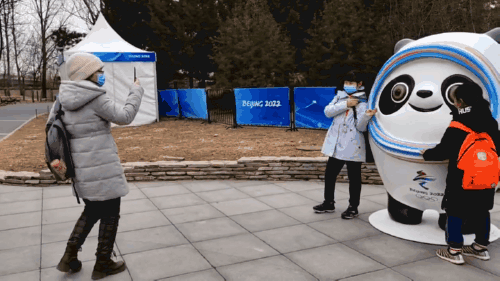 圖為海淀冬奧文化廣場(chǎng)門口,作為冬奧“頂流”的冰墩墩和雪容融吸引游客合影留念。女孩在冰墩墩前擺pose,媽媽趕忙拿起手機(jī)拍攝。中工網(wǎng)記者 劉云攝