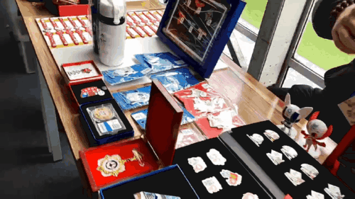 圖為收藏達(dá)人給游客介紹自己的各種徽章。中工網(wǎng)記者 劉云攝