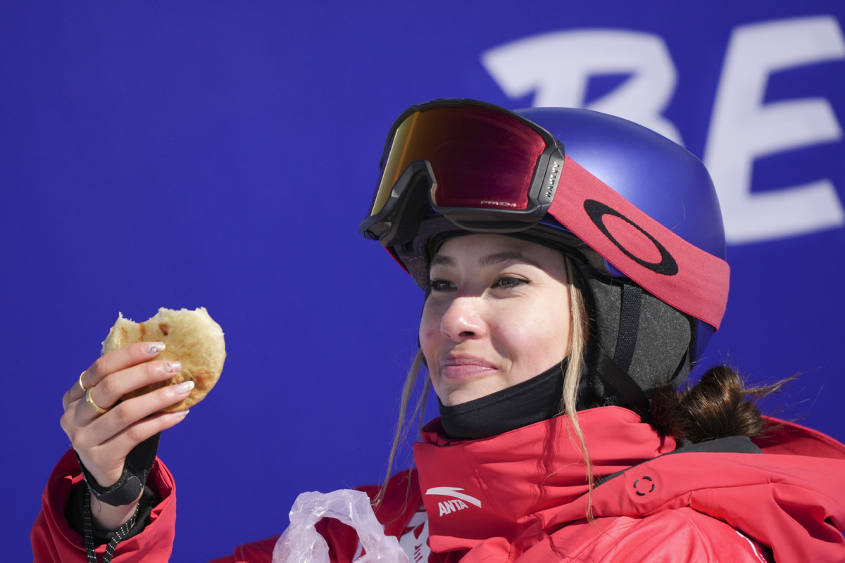 She has become the "red bean bun girl" in China after the scene was livestreamed globally that she was taking a crushed, flattened bun out of her competition suit pocket and had a big bite with a huge smile on her face during the breaks of her halfpipe qualifying run.
