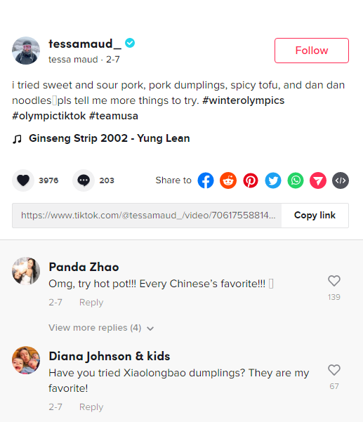 “我吃過糖醋里脊、豬肉餃子、麻婆豆腐和擔擔面。請告訴我更多可以嘗試的美食,”她在Tiktok上問道。粉絲們立刻在評論區(qū)列出了一系列人氣中國菜。