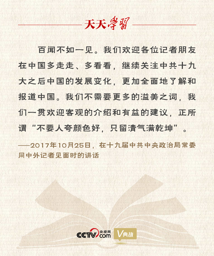 2017年10月25日,在十九屆中共中央政治局常委同中外記者見面時,習近平總書記對中外媒體表示“我們不需要更多的溢美之詞,我們一貫歡迎客觀的介紹和有益的建議”,并在講話中引用了“不要人夸顏色好,只留清氣滿乾坤”,體現(xiàn)了新一屆中央領(lǐng)導集體不慕虛名、真抓實干的務實作風。時隔不久,在2018年新年賀詞中,習近平總書記進一步闡釋道:“不馳于空想、不騖于虛聲,一步一個腳印,踏踏實實干好工作!