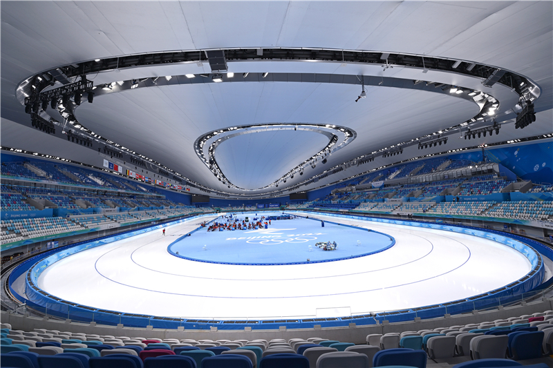 圖為運(yùn)動(dòng)員們在“冰絲帶”訓(xùn)練。 新華社記者武巍攝