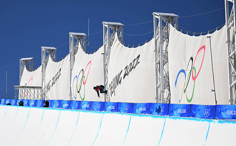 2月6日,參加北京冬奧會(huì)單板滑雪U型場地技巧比賽的運(yùn)動(dòng)員們在云頂滑雪公園全力備戰(zhàn)。 場地內(nèi)的防風(fēng)墻可以有效地降低大風(fēng)對(duì)運(yùn)動(dòng)員的干擾,保證賽事的正常運(yùn)行。河北日?qǐng)?bào)記者張昊攝