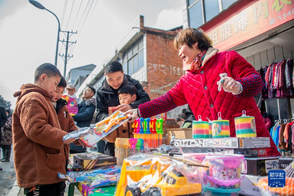 1月29日,小朋友在湖北省隨縣柳林鎮(zhèn)街頭的一個玩具攤前選購?fù)婢。新華社發(fā)(伍志尊 攝)