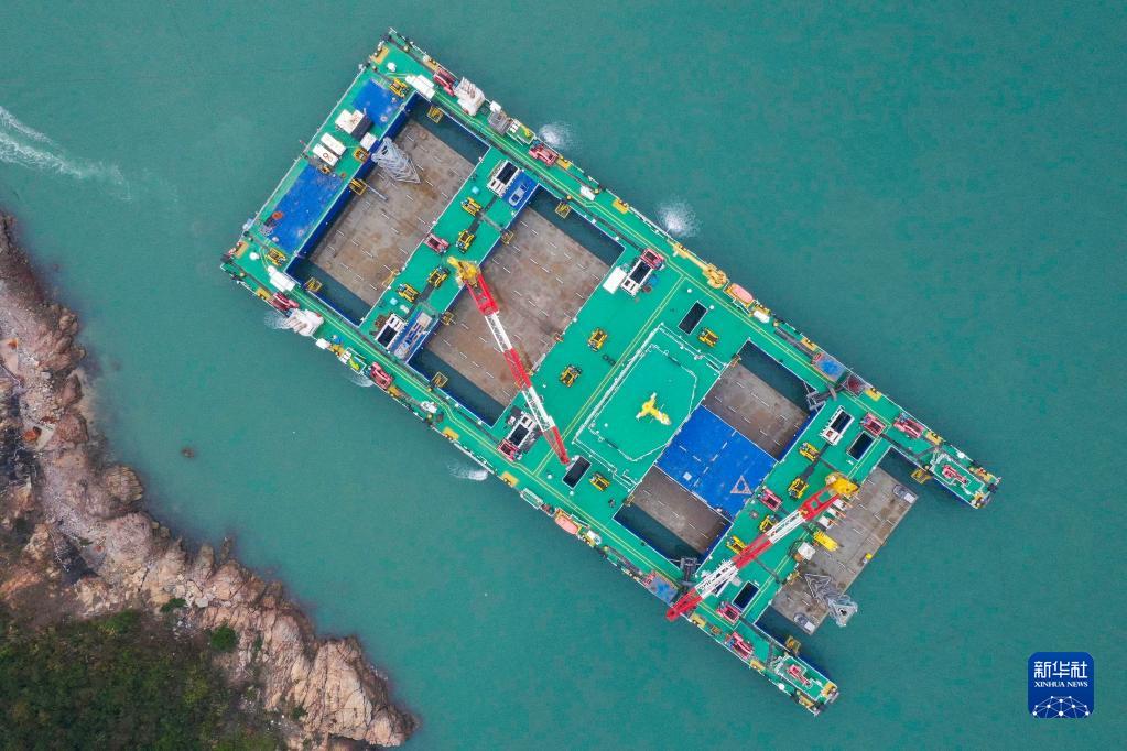 1月14日,中交一航局的“一航津安1”號沉管運輸安裝一體船搭載E16管節(jié)準備浮運前往珠江口伶仃洋安裝現(xiàn)場(無人機照片)。新華社記者 劉大偉 攝