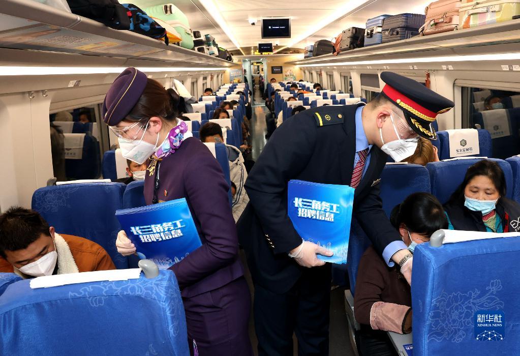 2月12日,列車乘務(wù)員在重慶開往上海的G1334次列車上,向春運返程務(wù)工人員發(fā)放招聘信息。新華社記者 陳飛 攝