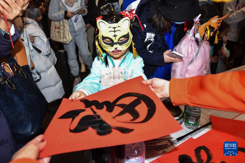 2月15日,在清華大學(xué)藝術(shù)博物館元宵節(jié)夜場活動上,佩戴虎頭面具的小朋友領(lǐng)取現(xiàn)場書寫的“!弊帧P氯A社記者 陳鐘昊 攝