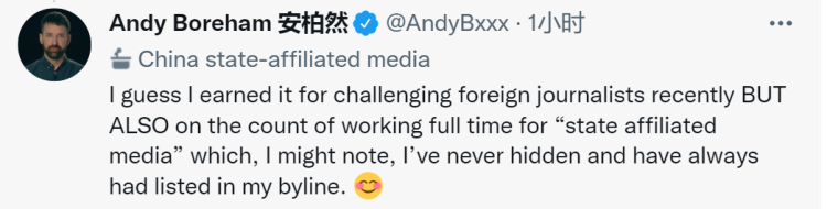 安柏然回復弗格森說,“我猜我獲得這一頭銜是因為我最近挑戰(zhàn)了一些外國記者,當然也是因為我是在‘官方媒體’全職工作,我可能要說明下,我從來沒有隱藏過這些,而且一直在我的署名列表里有說明。”推文還附帶一個微笑表情!