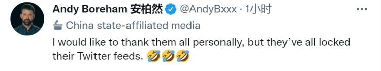 安柏然打趣調(diào)侃說,“我都想親自感謝他們,但他們的推特賬號都鎖定了(笑)。”↓