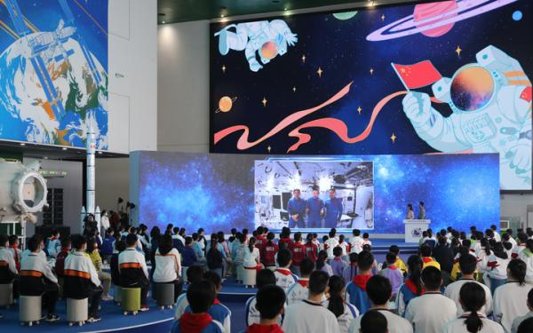2021年12月9日,“天宮課堂”第一課開課,神舟十三號(hào)乘組航天員翟志剛、王亞平、葉光富在空間站進(jìn)行太空授課。這是學(xué)生們?cè)诒本┲袊萍拣^聽課。新華社記者 金立旺 攝