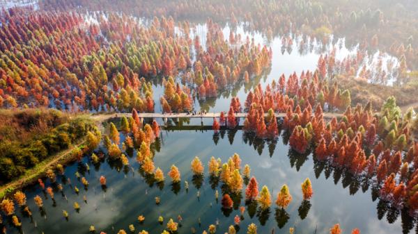 2021年12月10日拍攝的云南省昆明市的甸尾村水杉濕地一景(無人機(jī)照片)。新華社記者 胡超 攝