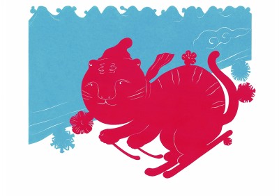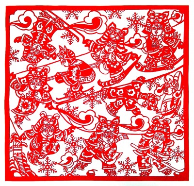 如果說中華優(yōu)秀傳統(tǒng)文化是剪紙藝術(shù)創(chuàng)作的根基與靈魂,那么當(dāng)代藝術(shù)精神和現(xiàn)代設(shè)計(jì)理念便成為剪紙藝術(shù)發(fā)展的動(dòng)力引擎。幽默詼諧的卡通形象、富有時(shí)尚感的視覺元素、新穎別致的構(gòu)圖方式……在多元文化相互交融的新媒體時(shí)代,剪紙藝術(shù)的面貌也日趨年輕化、國(guó)際化。筆者創(chuàng)作的冬奧系列剪紙作品,融合了冰雪運(yùn)動(dòng)與寅虎的雙重意象。在虎的形象設(shè)計(jì)方面,如何將冰雪運(yùn)動(dòng)的夸張動(dòng)態(tài)與動(dòng)物的肢體結(jié)構(gòu)及形態(tài)自然結(jié)合,是創(chuàng)作的難點(diǎn)。我在精細(xì)刻畫虎的形態(tài)、花紋等自然特征的基礎(chǔ)上,以圓潤(rùn)的肢體造型實(shí)現(xiàn)虎與人的動(dòng)態(tài)轉(zhuǎn)化,并讓各式雪花剪影點(diǎn)綴虎軀,打造出富于童趣又動(dòng)感十足的“小虎子運(yùn)動(dòng)員”形象,背景則運(yùn)用中國(guó)戲曲舞臺(tái)的構(gòu)成方式,概括地呈現(xiàn)出通透而富有古韻的空間氛圍。這套應(yīng)邀展陳在北京冬奧會(huì)張家口冬奧村的剪紙作品,不僅烘托出熱烈喜慶的氛圍,更傳達(dá)出對(duì)北京冬奧會(huì)運(yùn)動(dòng)健兒們“圓夢(mèng)在今朝”的濃濃祝福。此外,盧淑容的《冬奧情懷》以動(dòng)漫造型語言塑造人物,并輔以傳統(tǒng)花卉、祥云等紋樣,傳統(tǒng)與現(xiàn)代的相互碰撞使得作品充滿視覺張力;官紅艷的《和諧冬奧》運(yùn)用現(xiàn)代藝術(shù)語言,以高飽和度的色彩營(yíng)造作品風(fēng)格基調(diào),并對(duì)運(yùn)動(dòng)員的動(dòng)態(tài)進(jìn)行適度夸張?zhí)幚,時(shí)尚感十足。藝術(shù)家們?cè)趫?jiān)守傳統(tǒng)的基礎(chǔ)上大膽發(fā)揮想象力與創(chuàng)造力,使作品在記錄生活、謳歌時(shí)代的同時(shí),展現(xiàn)出獨(dú)特的藝術(shù)個(gè)性,多維度的創(chuàng)作探索為剪紙藝術(shù)的發(fā)展注入了蓬勃的生命力。