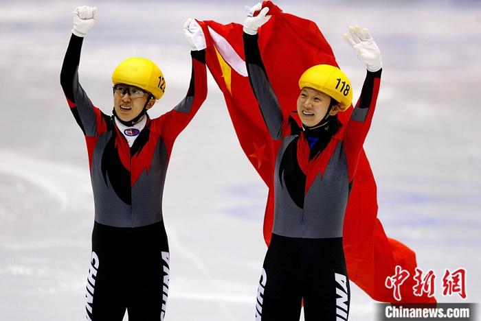 2002年2月16日,美國鹽湖城,2002鹽湖城冬奧會短道速滑女子500米決賽,楊揚(左)奪得冠軍。為中國代表團(tuán)實現(xiàn)冬奧會金牌“零的突破”。 圖片來源:視覺中國