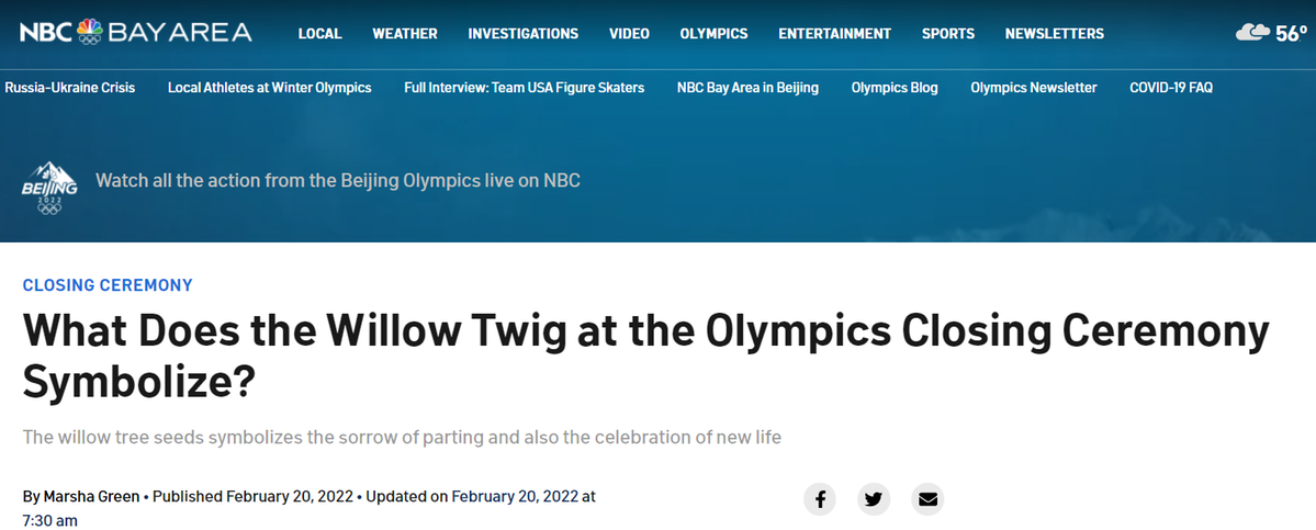 中國(guó)日?qǐng)?bào)網(wǎng)2月21日電 “又一屆冬奧會(huì)落下帷幕,每一次的閉幕儀式中,都會(huì)有歡樂(lè)、慶祝和反思的時(shí)刻!碑(dāng)?shù)貢r(shí)間20日,美國(guó)國(guó)家廣播公司NBC報(bào)道了一篇題為《奧運(yùn)會(huì)閉幕式上的柳枝象征著什么?》的文章,揭秘了閉幕式以“折柳”作為“緬懷”主題的深刻寓意及主創(chuàng)團(tuán)隊(duì)的獨(dú)具匠心。