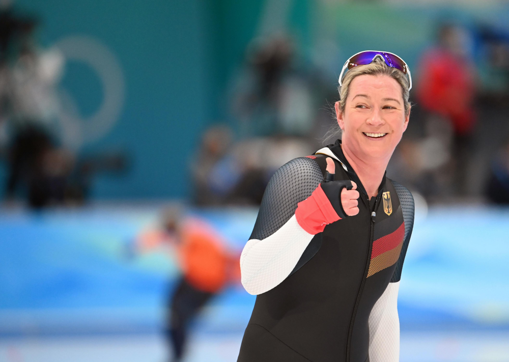 沖過(guò)速度滑冰女子3000米終點(diǎn)線時(shí)克勞迪婭·佩希施泰因高舉雙臂迎接屬于自己的“第一”49歲的她是歷史上年紀(jì)最大的女子冬奧選手這是她的第八次奧運(yùn)會(huì)