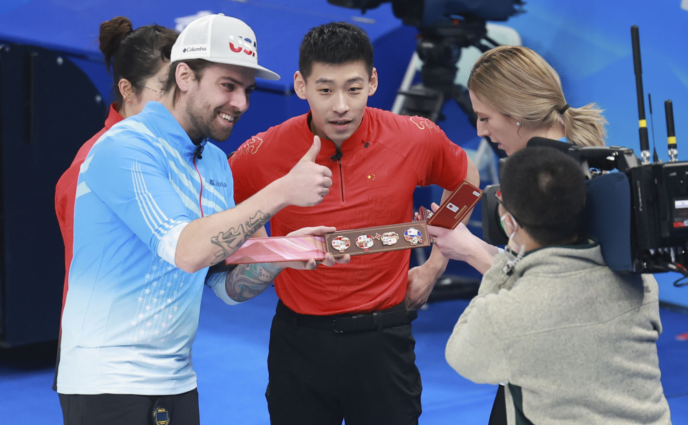 冰壺混雙比賽后中國(guó)選手凌智和范蘇圓向?qū)Ψ劫?zèng)送“冰墩墩”奧運(yùn)紀(jì)念徽章美國(guó)選手驚喜地接過(guò)禮物四人合影留念中國(guó)組合隨后也收到了美國(guó)隊(duì)回贈(zèng)的徽章 離開(kāi)賽場(chǎng)我們和“冰墩墩”一起見(jiàn)證了中國(guó)文化的魅力