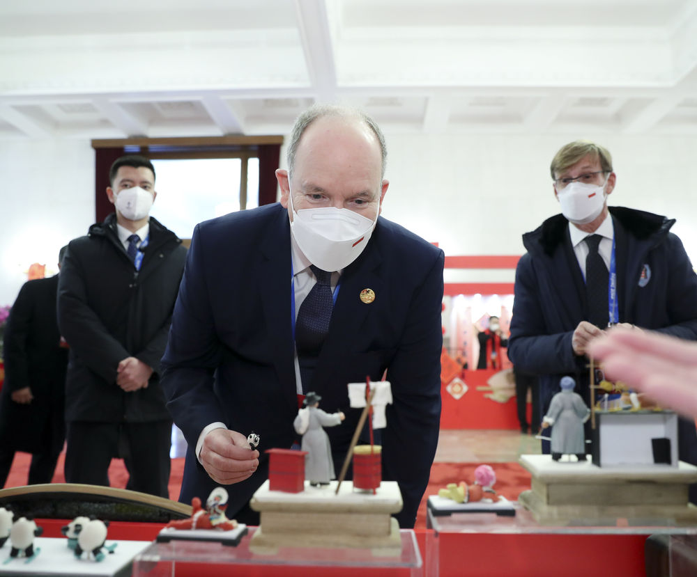 在人民大會(huì)堂舉行的新春“廟會(huì)”上摩納哥元首阿爾貝二世親王被“冰墩墩”面塑所吸引他捏完一個(gè)“冰墩墩”還想再捏一個(gè)因?yàn)榧依镉幸粚?duì)雙胞胎孩子如果只帶回一個(gè)那就不好交代了