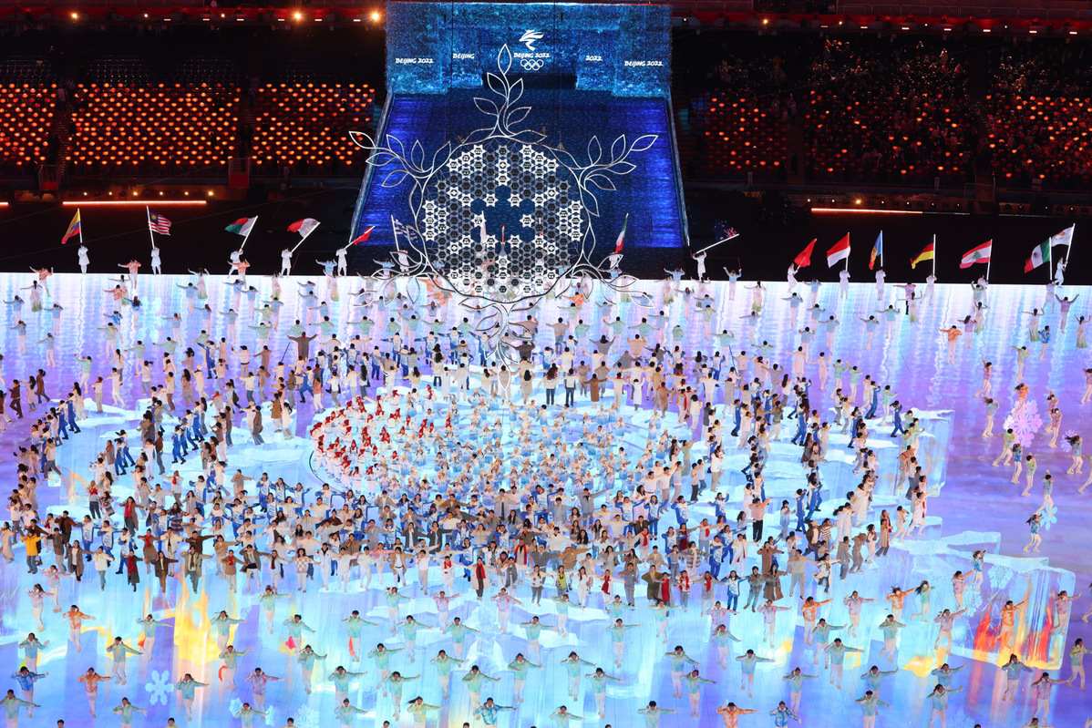 與開幕式一樣,閉幕式亦由張藝謀擔任總導演。晚8點,閉幕式正式開始。音樂響起,一群可愛的孩子出現(xiàn)在舞臺上——他們手持雪花造型的花燈,在“冰面”上盡情嬉鬧、舞蹈。隨著表演進行,孩子們在不同位置用手中的小花燈點亮地屏上的“冬”字會徽。一時間,華燈盛照,暖意融融。